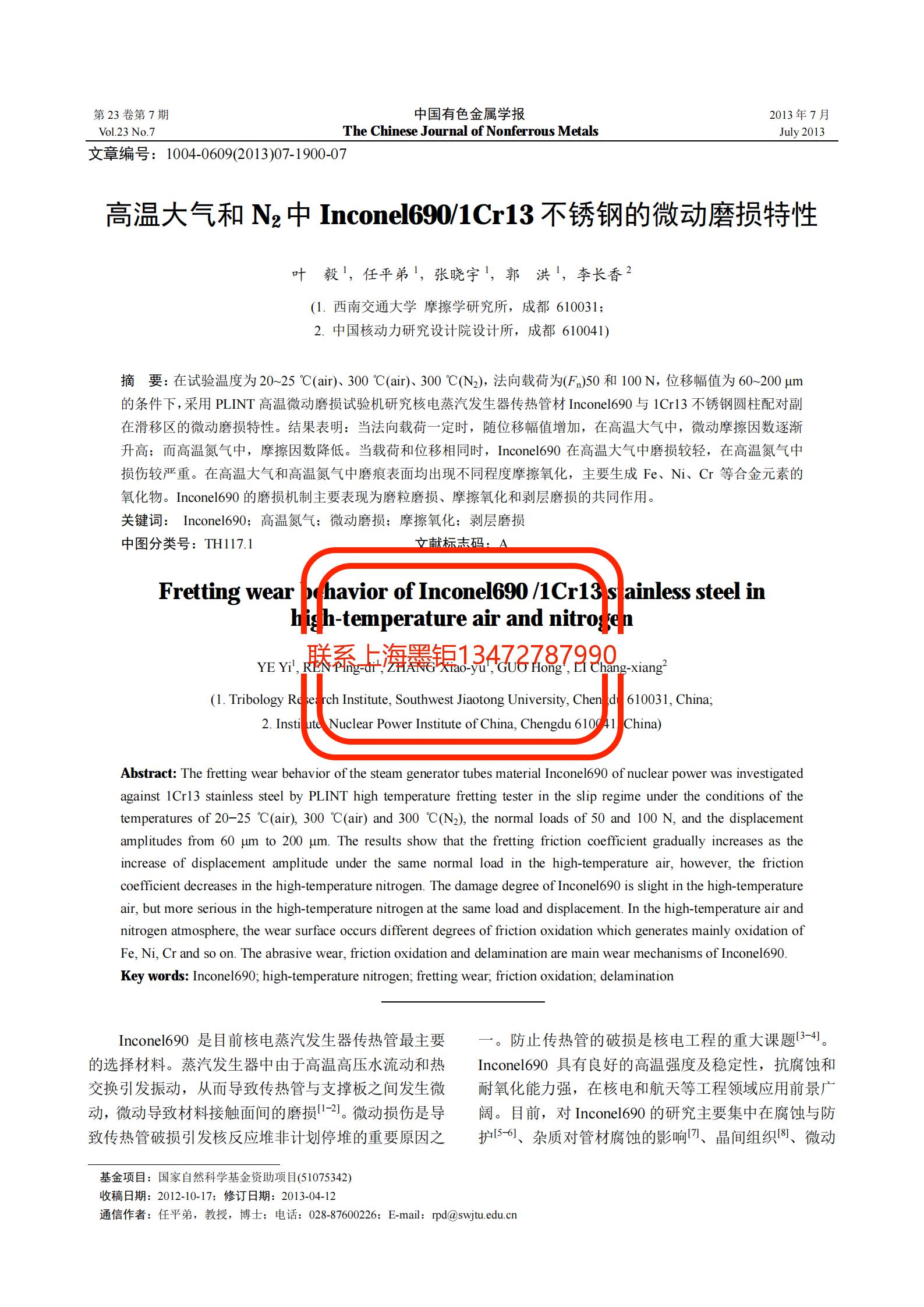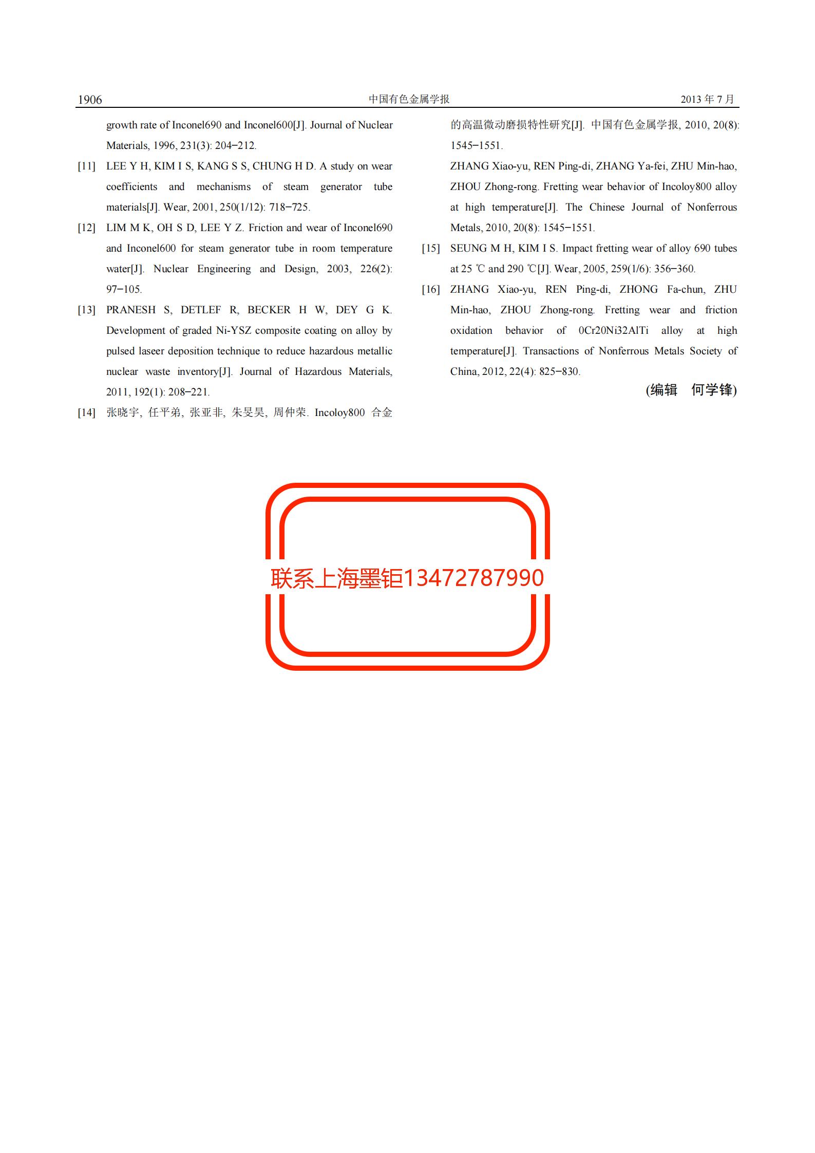 技術文章 高溫大氣和N_2中Inconel690_1Cr13不銹鋼的微動磨損特性 更新時間 2021-07-12 10:22:54 閱讀 765 上一篇:Inconel600鎳基合金熱軋板表面起皮缺陷原因分析 下一篇:第一降溫器Inconel600_Q345鎳基復合鋼板的焊接